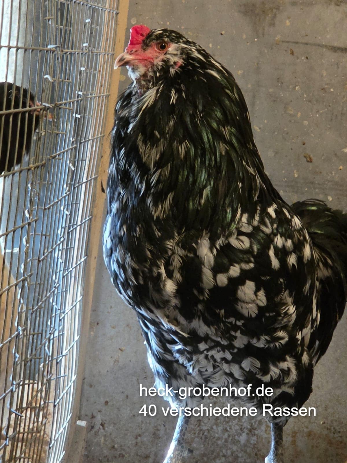 Die Ameraucana ist eine relativ junge Hühnerrasse, die in den 1970er-Jahren in den USA aus südamerikanischen Araucana-Linien herausgezüchtet wurde. Ziel war es, die attraktive blaue Eierfarbe zu erhalten und gleichzeitig eine genetisch stabile und standardisierte Rasse zu schaffen. Besonders selten und noch sehr neu ist der Farbschlag „Ermine“. Er zeigt ein weißes Grundgefieder mit dunkler Hals- und Schwanzpartie und ist damit optisch besonders auffällig. Da dieser Farbschlag spalterbig ist, fallen in den Nachzuchten jedoch auch weiße und schwarze Tiere. Zudem können, da sich die Zucht erst im Aufbau befindet, vereinzelt noch Fehlfarben auftreten.
