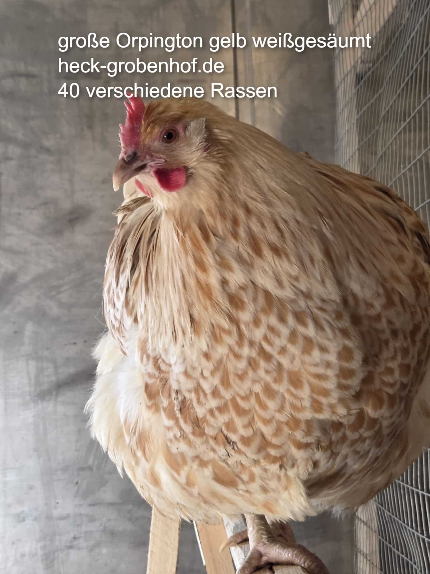 Die großen Orpington in gelb-weißgesäumt vereinen eindrucksvolle Erscheinung mit einem außergewöhnlich ruhigen und freundlichen Wesen. -die Gelb-weißgesäumten Orpington fallen mit ihrem warmen Farbton besonders auf.